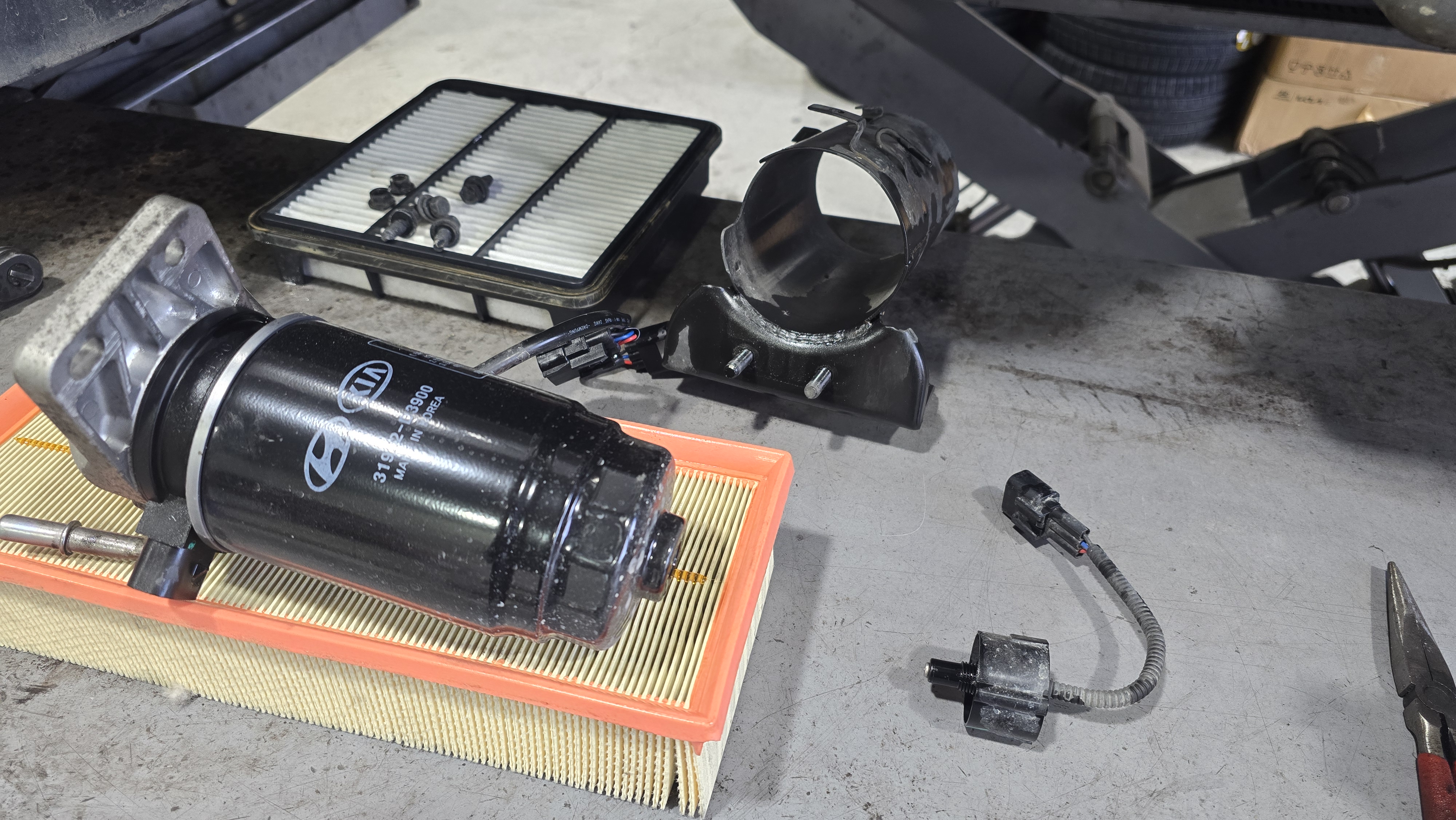 포터2 연료필터 에어 빼기는 조립을 다 한 다음 키 온 상태로 10초 기다렸다가 키 오프 상태로 10초 그리고 다시 온 10초 이런 식으로 반복해서 수 회 반복합니다. 저는 열 번 정도하고 시동을 거는데 에어 빼기를 덜 한 상태에서 계속 시동을 시도하다 방전이 되는 경우도 많으니 주의하시길 바랍니다.